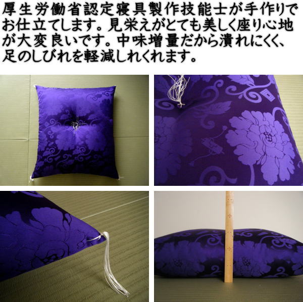 通常の座布団より、沢山の中わたを使用しているため、15cm前後のかさ高、厚みがあり、非常に座り心地が良いです。